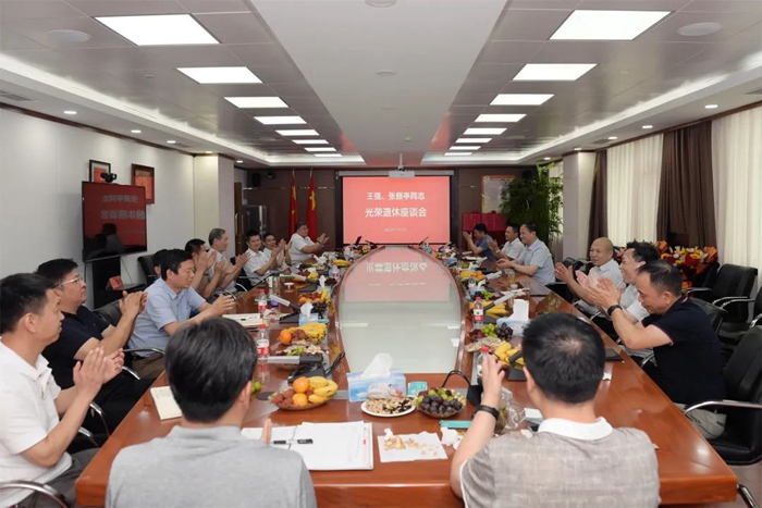 7月12日,江南jiangnan(中国)党委召开座谈会,欢送光荣退休的房地产公司原党总支书记、董事长王强和华腾东光公司原党总支副书记、总经理张振亭。